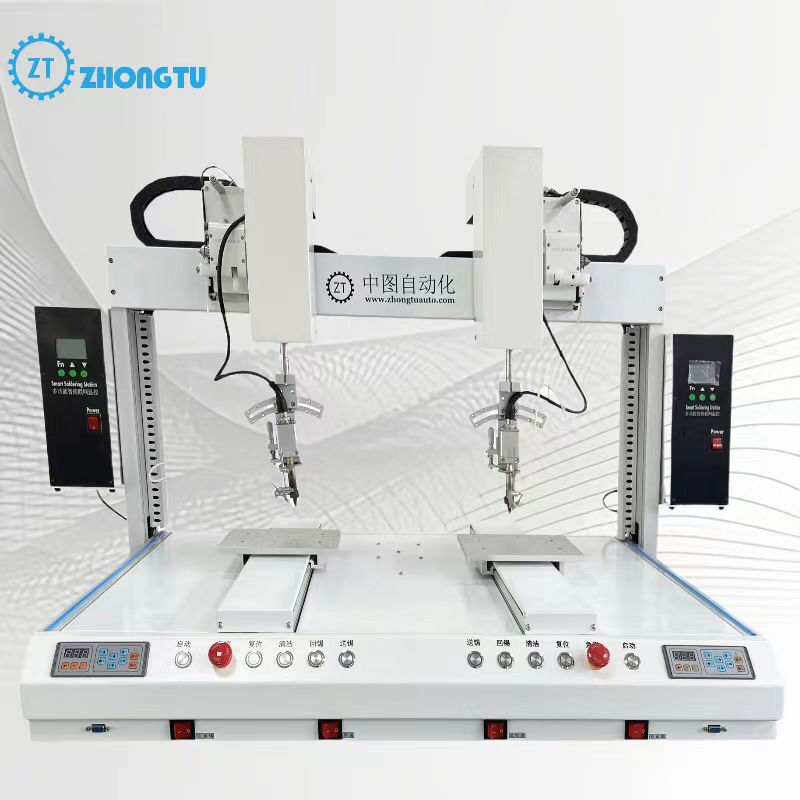 Zaawansowany automatyczny robot lutowniczy przeznaczony do precyzyjnych zastosowań lutowniczych w zakładach produkcyjnych, procesach SMT i DIP. Posiada podwójne głowice lutownicze i oś obrotową dla zwiększonej elastyczności i produktywności.